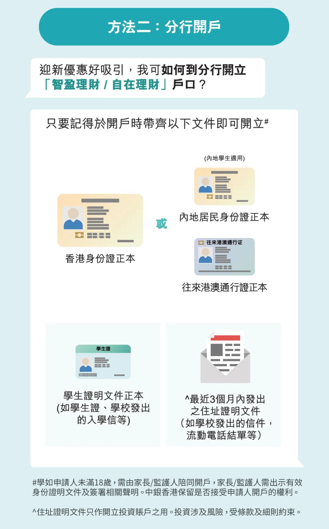 (a)合資格學生於推廣期: (i) 透過中國銀行(香港)有限公司(「中銀香港」)分行或透過「中銀香港手機銀行」流動應用程式全新選用「智盈理財/自在理財」;及(ii) 成功申請「大灣區青年卡」 /「中銀科大白金卡」/「中銀樹仁大學信用卡」/「中銀香港都會大學雙幣白金卡」/「中銀Chill Card」;