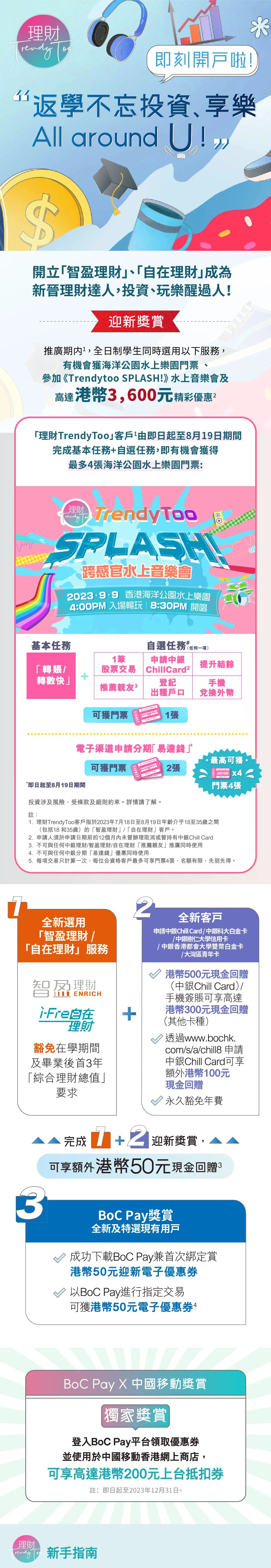 2.港幣3,600元優惠包括:額外迎新獎賞港幣50元、申請中銀Chill Card高達港幣600元獎賞,大專生專屬優惠 BoC Pay獎賞高達港幣100元及「推薦親友」高達港幣2,850元。