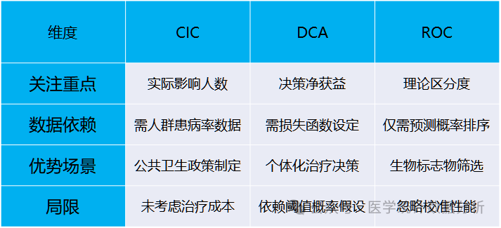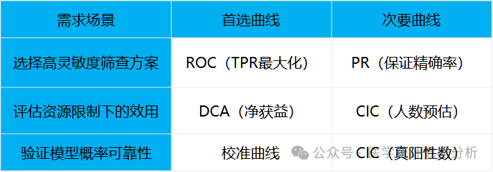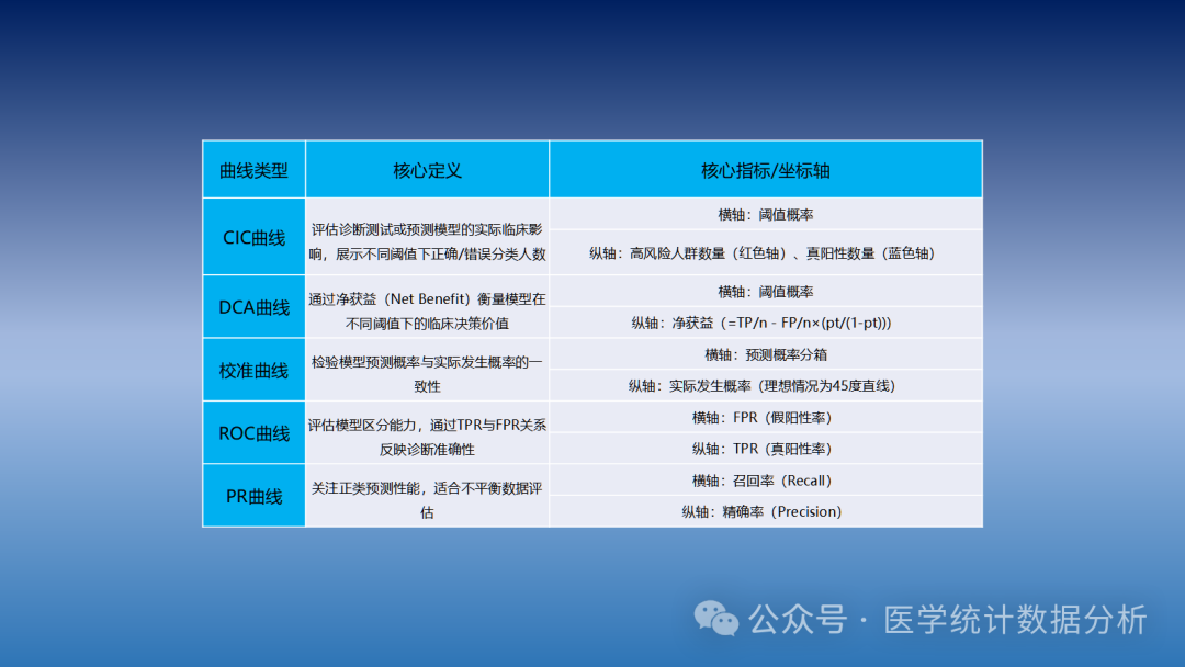 CIC曲线、DCA曲线、校准曲线、ROC曲线和PR曲线的概念、区别及其在医学统计中的应用。