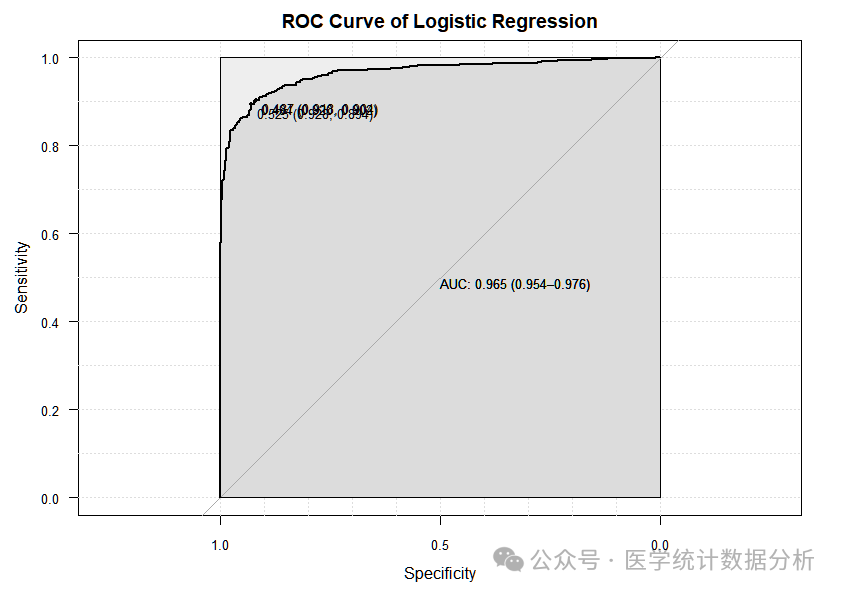 plot=T, ci=T, main="ROC Curve of Logistic Regression",