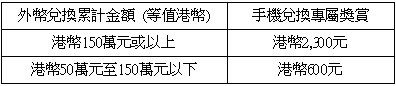 3. 合資格跨境客戶須於推廣期內以其單名形式持有的中銀香港港元/外匯寶/人民幣賬戶經中銀香港手機銀行成功兌換外幣達以下指定累計金額,方可獲享手機兌換外幣獎賞(「手機兌換專屬獎賞」):