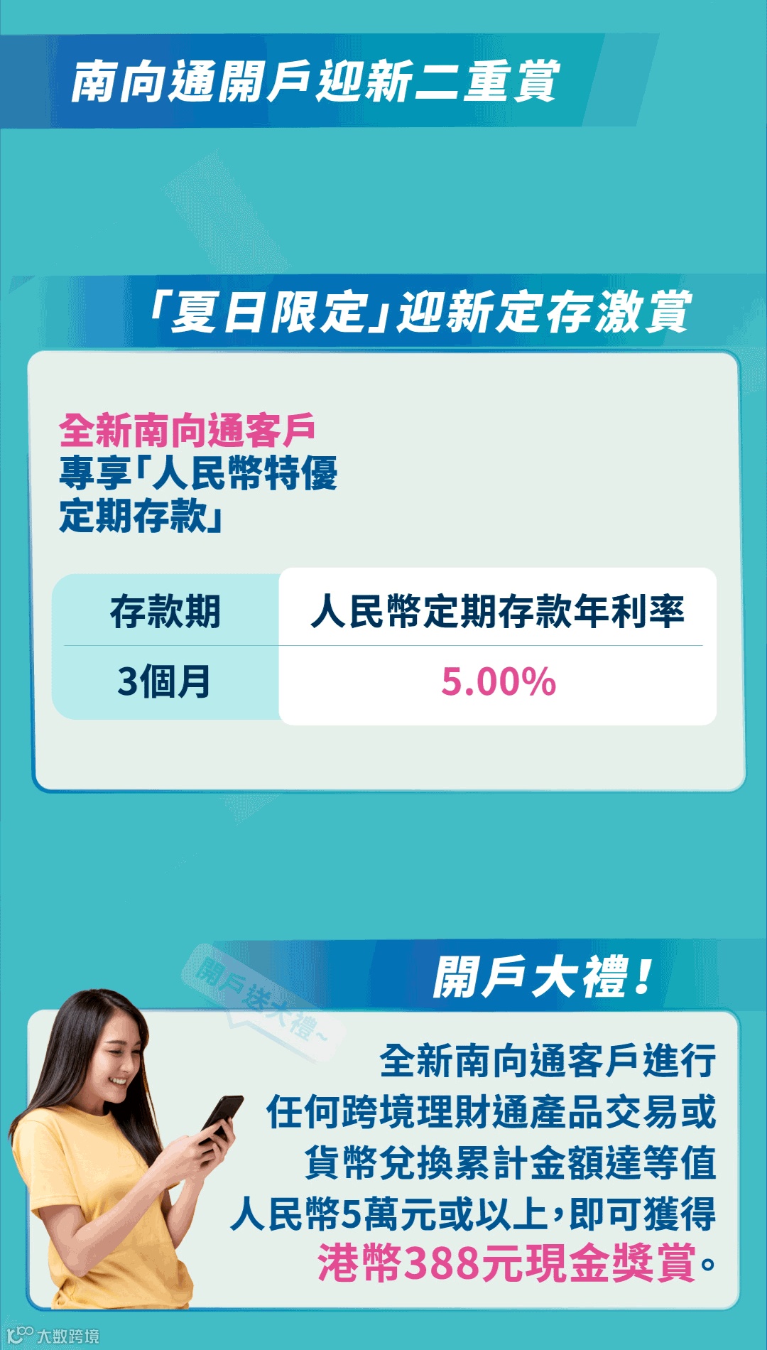 5. 每位特選中銀跨境理財通「南向通」投資專戶客戶於推廣期內只可開立「人民幣特優定期存款」金額上限為人民幣100萬元。