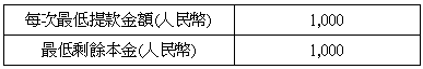4. 合資格客戶可於開立「人民幣靈活高息定期存款(特選客戶)」起1天(「最短存款期」)後的任何一個銀行營業日透過網上銀行或中銀香港屬下任何一家分行提取部分或全部存款。提前提取款項的利息,將按「實際存款天數」(即由「人民幣靈活高息定期存款(特選客戶)」起息日起計算至提取款項的前一天)的對應存款期及相關年利率計算(各對應存款期的年利率及有關起息日期會於開立定期存款時協定,並將顯示於定期存款確認通知的「存款利率概要」部分),有關利息將於提取存款時一併存入合資格客戶的指定賬戶內。如合資格客戶於「最短存款期」內提取存款,將不獲享任何利息,中銀香港並保留徵收費用的權利。 合資格客戶可於「最短存款期」後多次提取部分存款,惟須符合以下每次最低提款金額及提款後的最低剩餘本金要求: