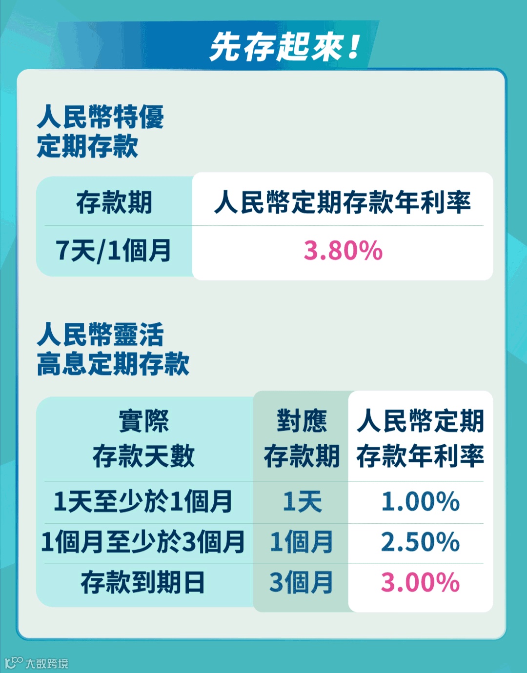 4. 每位特選中銀跨境理財通「南向通」投資專戶客戶於推廣期內只可開立「人民幣特優定期存款」一次及金額上限為人民幣100萬元。