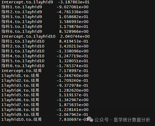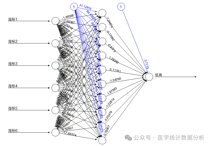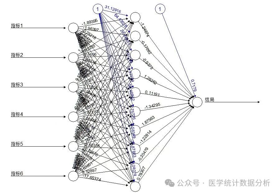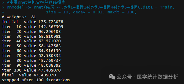 nnmodel <- nnet(结局 ~ 指标1+指标2+指标3+指标4+指标5+指标6,data = Train,