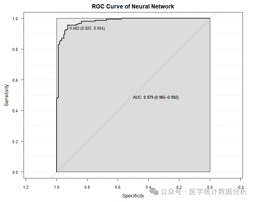 plot=T, ci=T, main="ROC Curve of Neural Network",