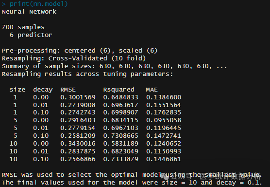 R语言中的train函数位于caret包中。caret包是一个用于构建、训练和评估机器学习模型的R包,提供了丰富的功能来帮助用户进行模型训练和参数调优。train函数是caret包的核心功能之一,用于训练模型,支持多种算法和模型类型。我们先用train函数拟合神经网络模型。