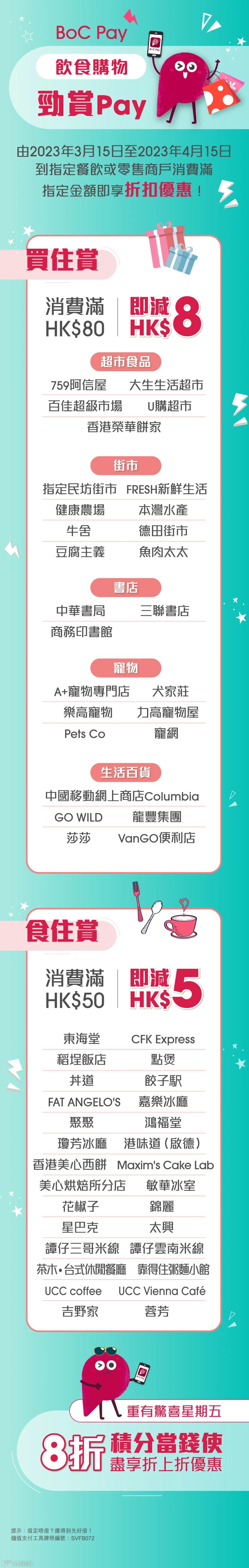 1. 「BoC Pay食住賞立減優惠」推廣活動(下稱「本推廣」)之推廣期為2023年3月15日至4月15日,包括首尾2日(下稱「推廣期」)。