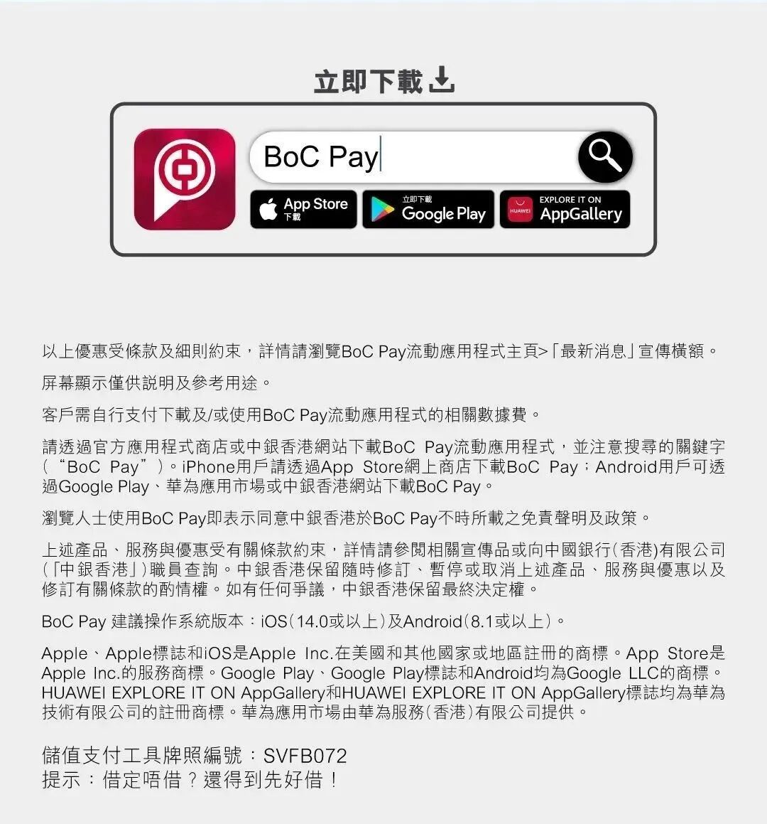 13. 請透過官方應用程式商店或中銀香港網站下載BoC Pay流動應用程式,並注意搜尋的關鍵字(“BoC Pay”)。iPhone用戶請透過App Store下載BoC Pay;Android用戶可透過Google Play商店、華為應用市場或中銀香港網站下載BoC Pay。