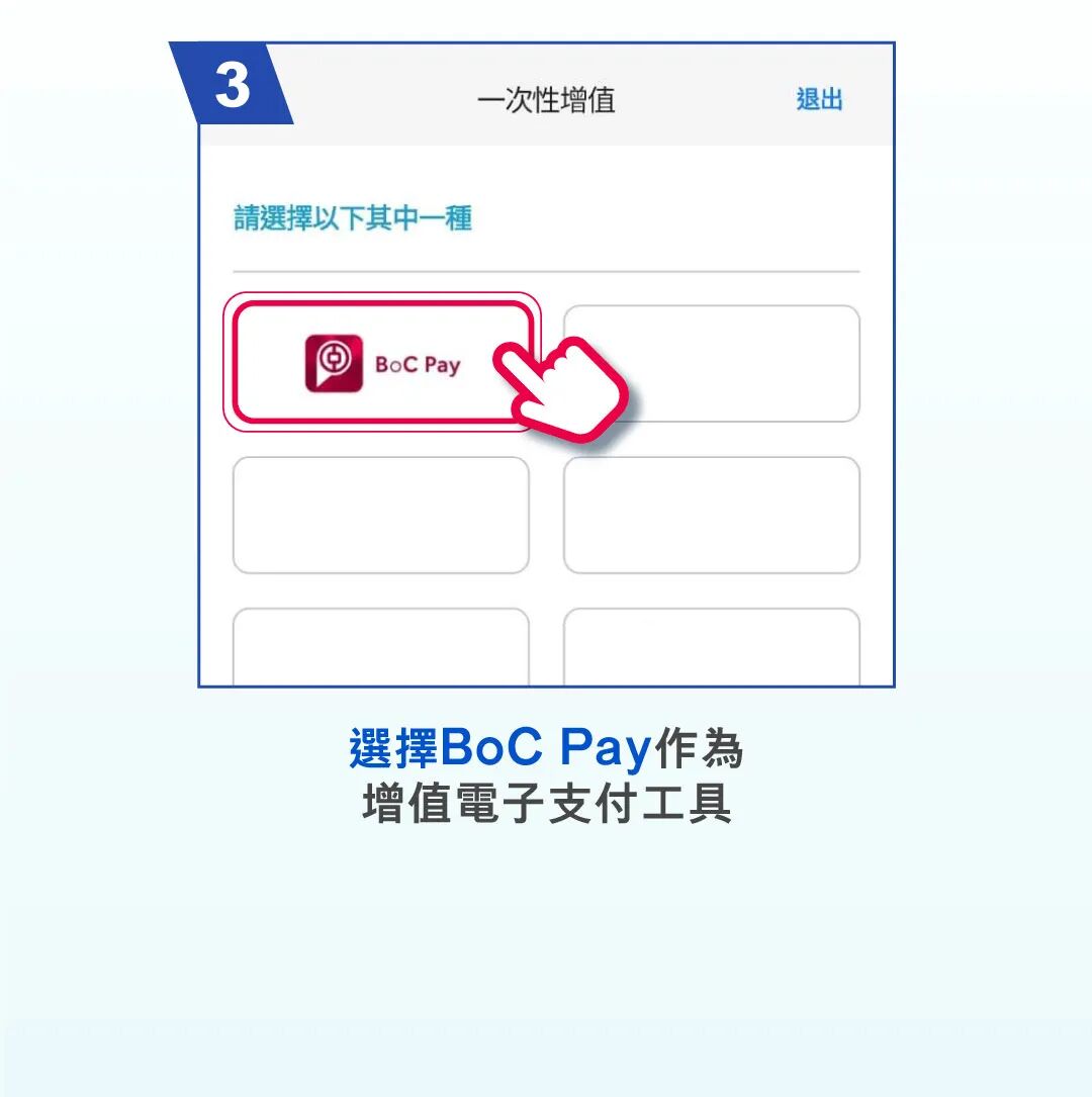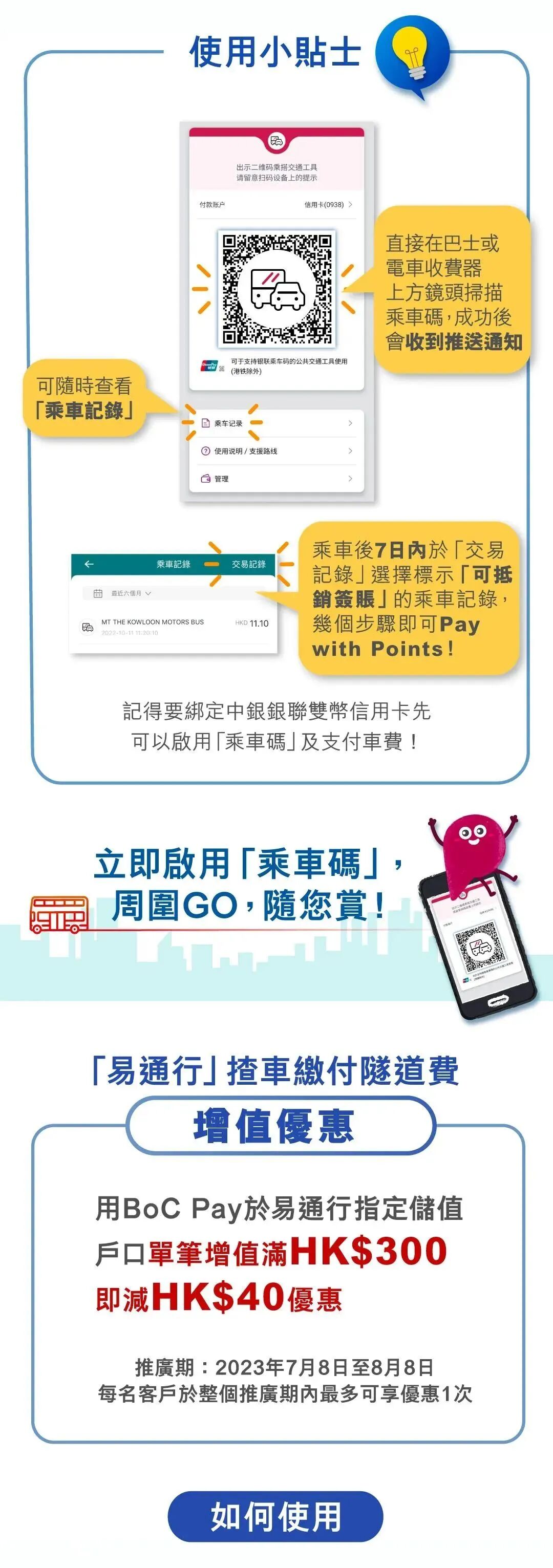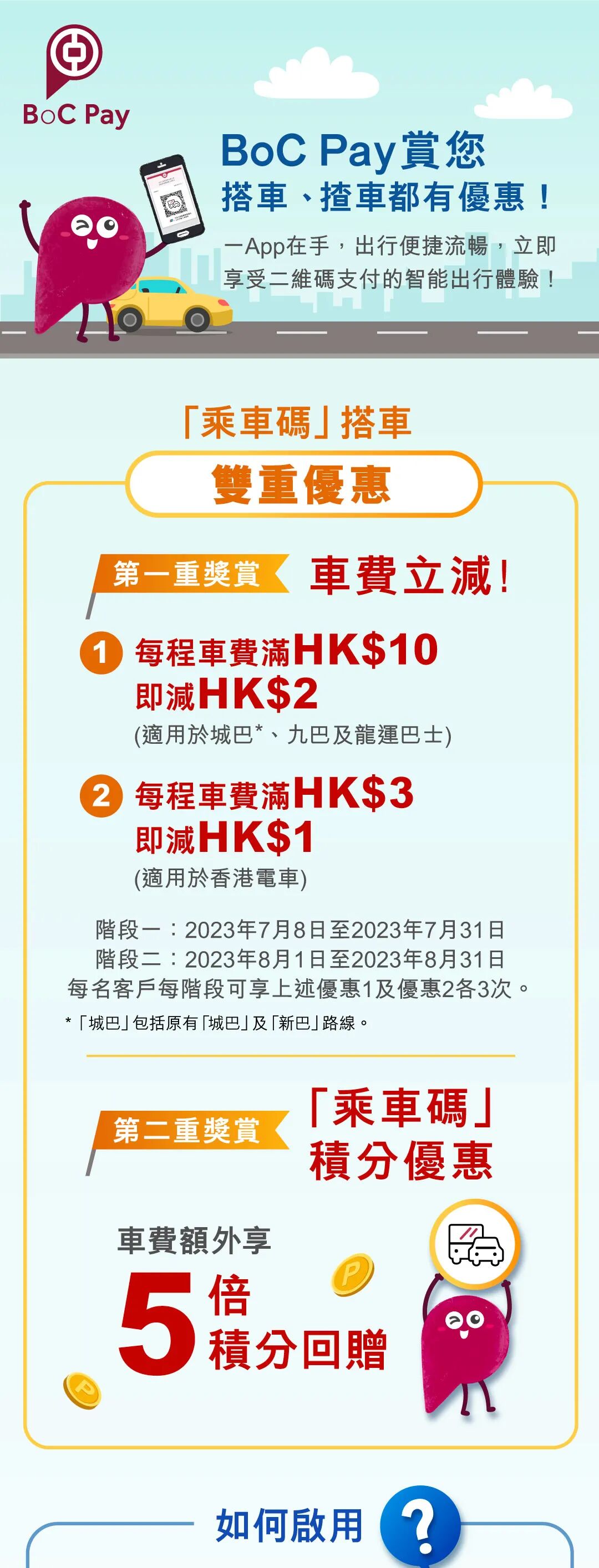 3. 於推廣期內,合資格客戶使用BoC Pay乘車碼進行合資格交易,可享車費立減優惠。