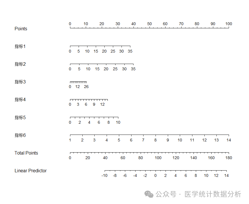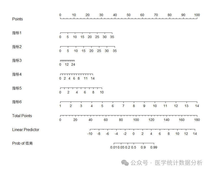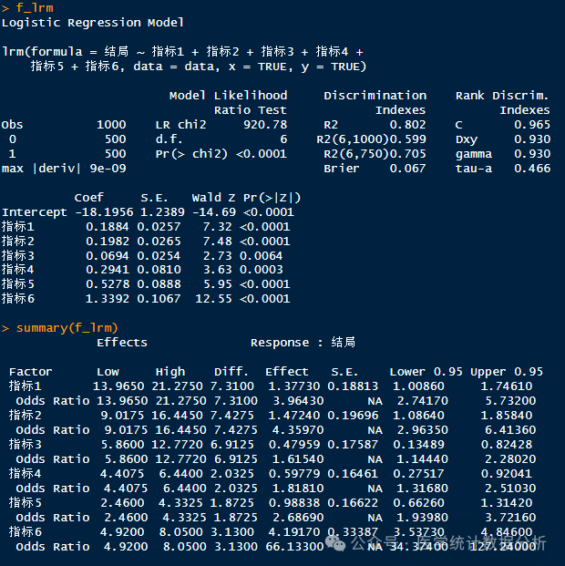 f_lrm <- lrm(结局 ~ 指标1+指标2+指标3+指标4+指标5+指标6,