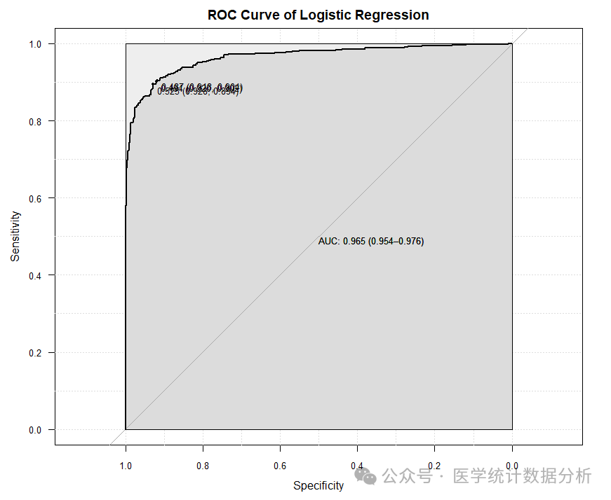 plot=T, ci=T, main="ROC Curve of Logistic Regression",