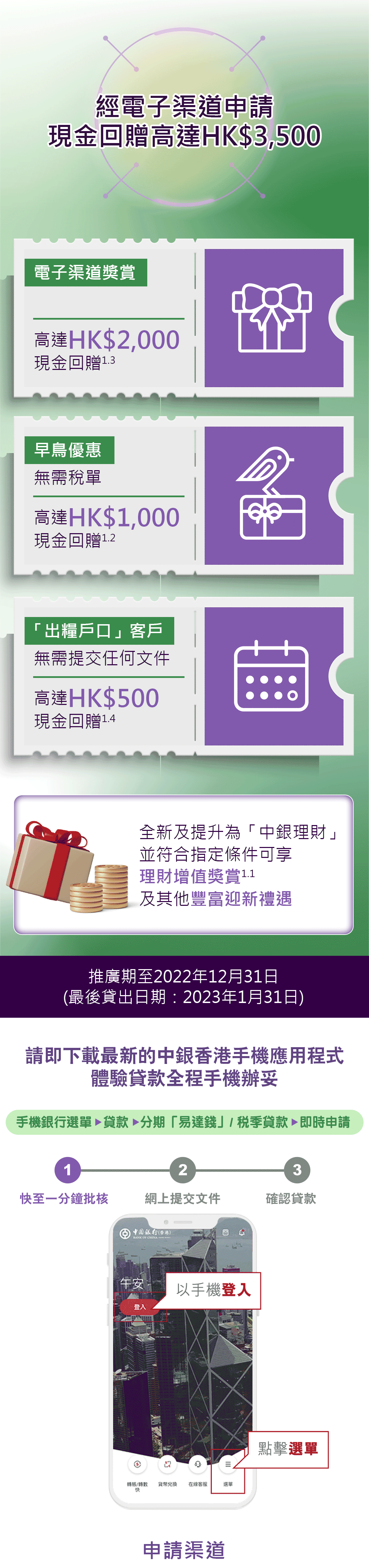 · 於推廣期內申請中銀分期「易達錢」- 稅季貸款,而成功貸款額達港幣5萬或以上,及還款期達24個月或以上;及