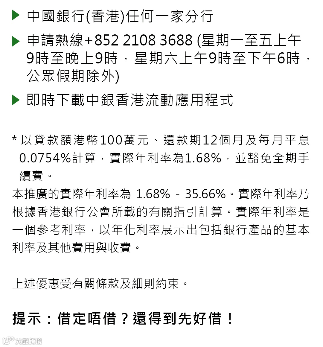 實際年利率乃根據香港銀行公會所載的有關指引計算。實際年利率是一個參考利率,以年化利率展示出包括銀行產品的基本利率及其他費用與收費。上述例子乃基於多項假設計算並只作參考用途。有關貸款及優惠之詳情、利率、手續費、實際年利率、條款及細則,請向中銀香港職員查詢。