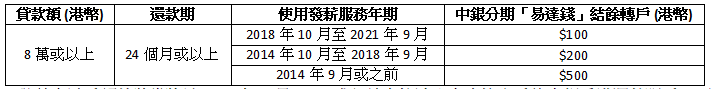 於推廣期內申請中銀分期「易達錢」結餘轉戶,而成功貸款額達港幣8萬或以上,及還款期達24個月或以上; 及