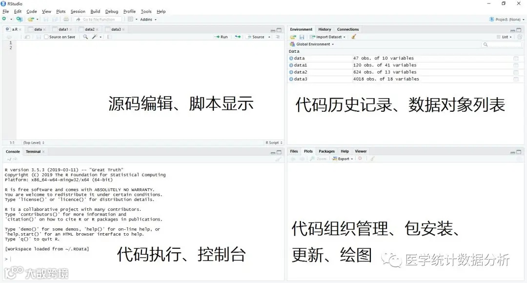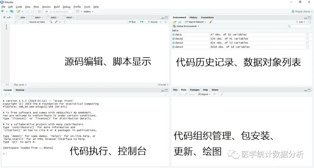 打开RStudio之后,会出现上图所示的窗口,其中有四个独立的面板。RStudio界面分为左上角的源码编辑、脚本显示,左下角的代码执行、控制台,右上角的代码历史记录、数据对象列表,右下角的代码组织管理、包安装、更新、绘图。
