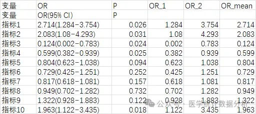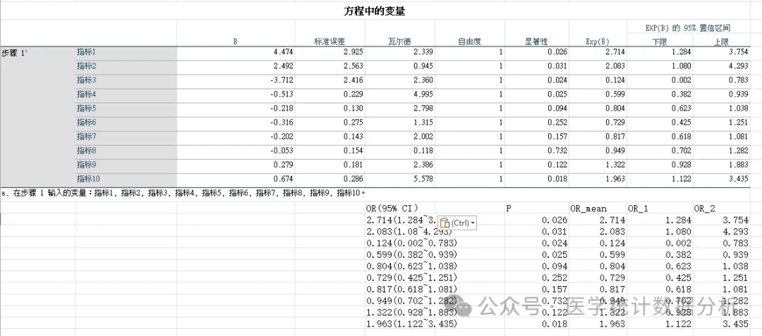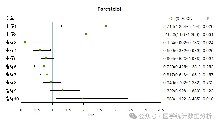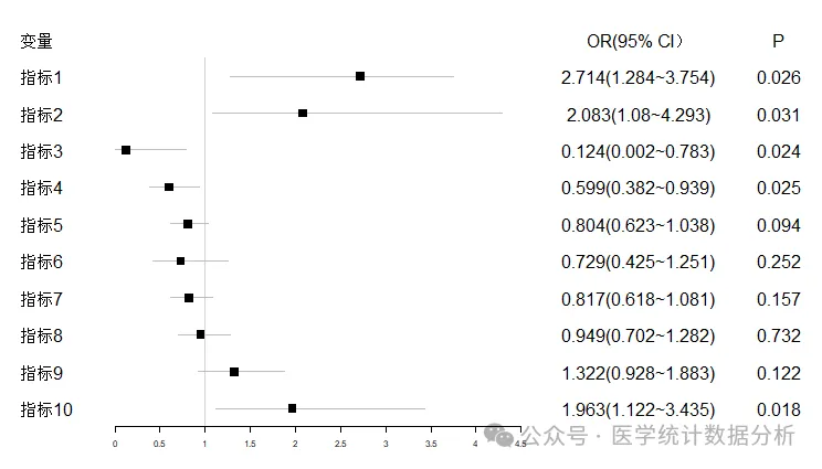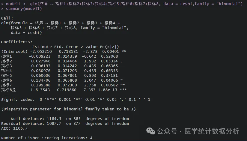 model1 <- glm(结局 ~ 指标1+指标2+指标3+指标4+指标5+指标6+指标7+指标8, data = ceshi,family = "binomial")