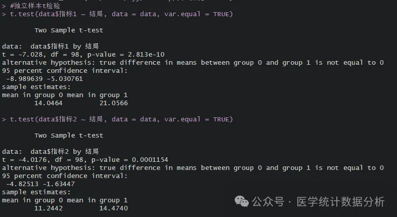 t.test(data$指标1 ~ 结局, data = data, var.equal = TRUE)