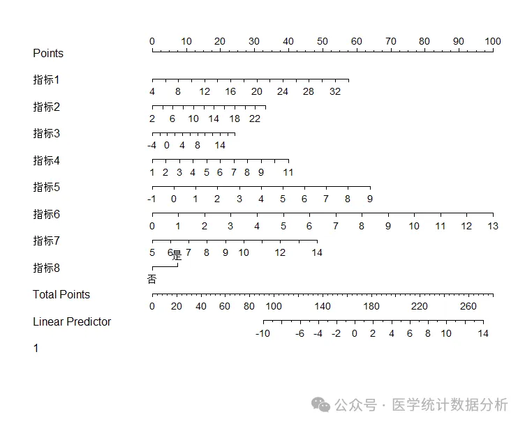 fit2<- lrm(结局~指标1+指标2+指标3+指标4+指标5+指标6+指标7+指标8,data=ceshi,x=TRUE,y=TRUE)