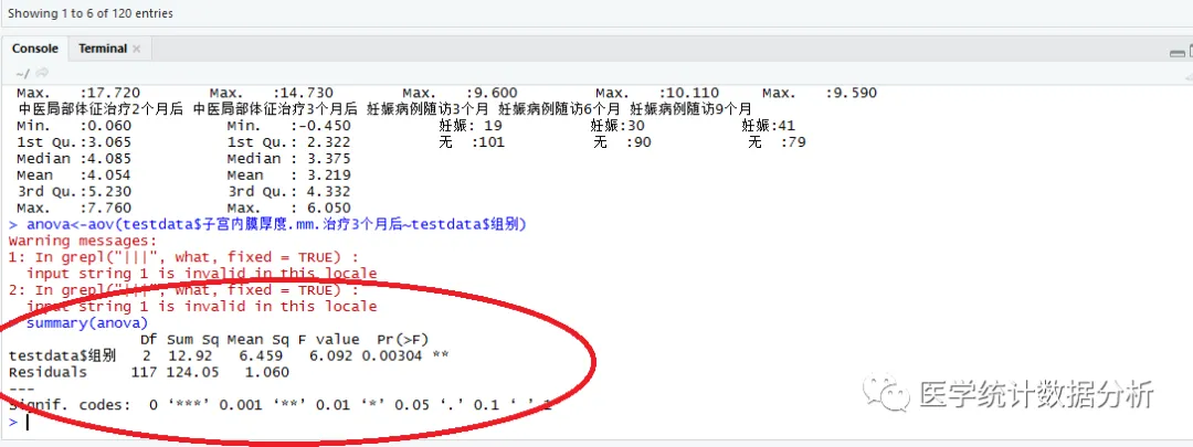 summary(anova) 语句,可得方差分析结果:DF/SS/MS/F值/P值