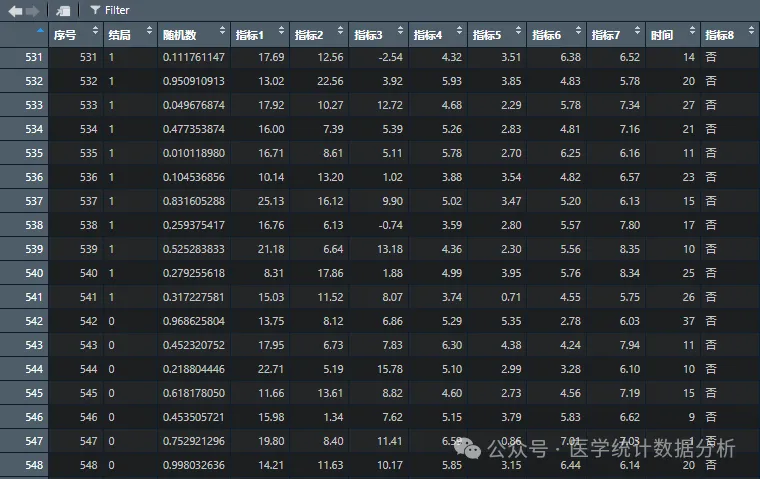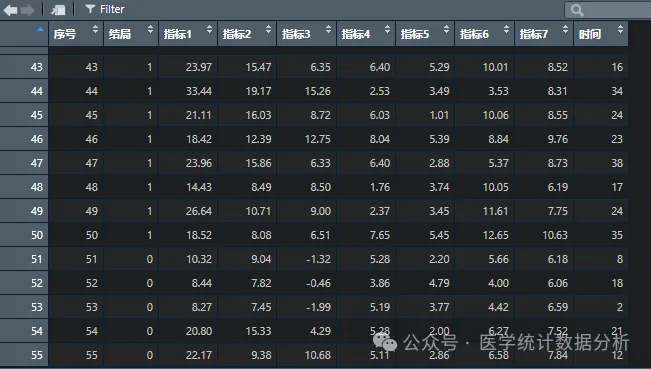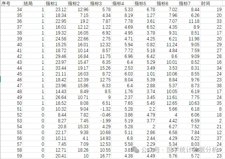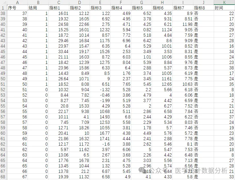 首先我们打开上的测试数据库,因变量结局为二分类变量,自变量中有定量变量和分类变量,如下图: