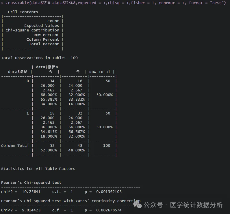 CrossTable(data$结局,data$指标8,expected = T,chisq = T,fisher = T, mcnemar = T, format = "SPSS")