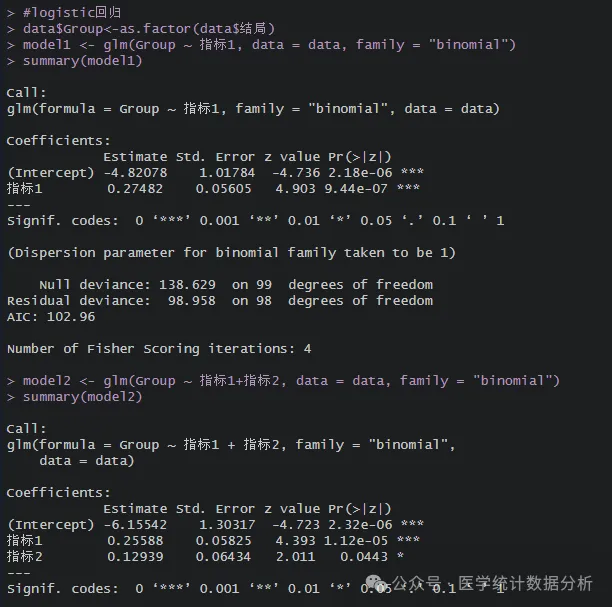 model2 <- glm(Group ~ 指标1+指标2, data = data, family = "binomial")
