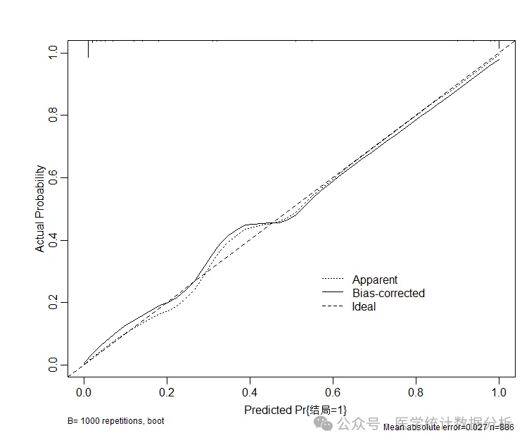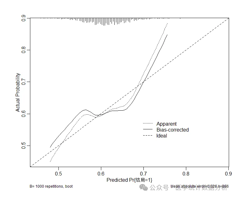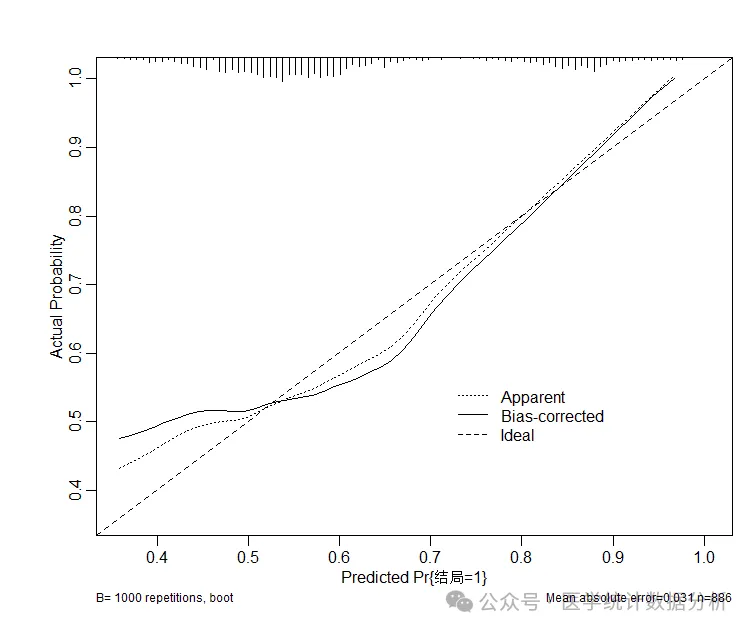 在临床预测模型的评估中,校准曲线是一种重要的工具,用于确保模型的预测结果在实际应用中是可靠和有效的。通过校准曲线的分析,可以判断模型是否高估或低估了实际风险,从而帮助改进模型或提供更准确的预测。
