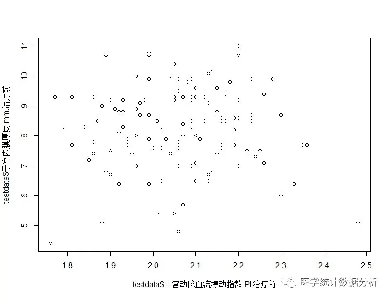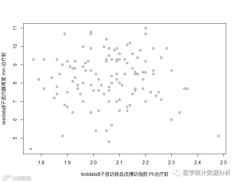 使用cor.test(testdata$1,testdata$2)语句做相关性分析,使用plot(因素1,因素2)语句画出散点图。