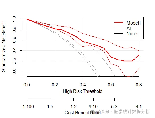 DCA曲线(Decision Curve Analysis)则更侧重于临床决策的实际应用,将患者或决策者的偏好整合到分析中,考虑特定模型的临床效用。它不仅评估模型的诊断准确性,还考虑了模型的临床价值,即在特定情况下模型是否值得使用,以及如何选择最佳模型。