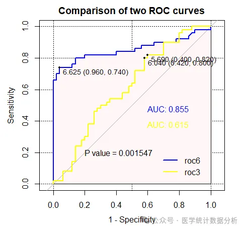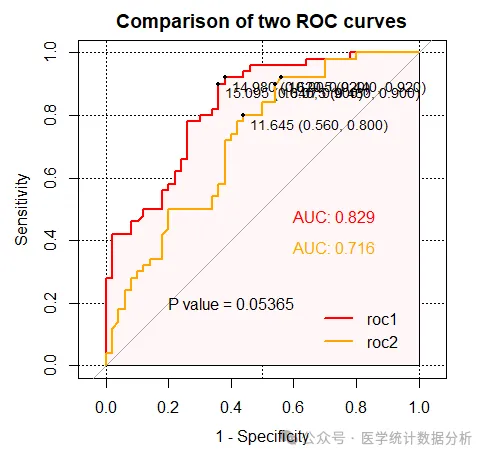 testobj <- roc.test(roc1,roc2) # 检验两条曲线