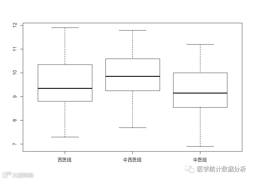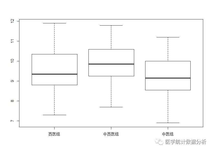 使用plot(分组因素,研究因素)语句,可画出三组比较的箱形图: