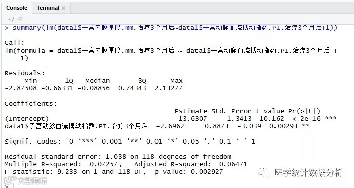 使用> lm(Y~X+1)语句及> summary(lm(Y~X+1))语句得到一元线性回归的B值、R2、残差分析等结果。