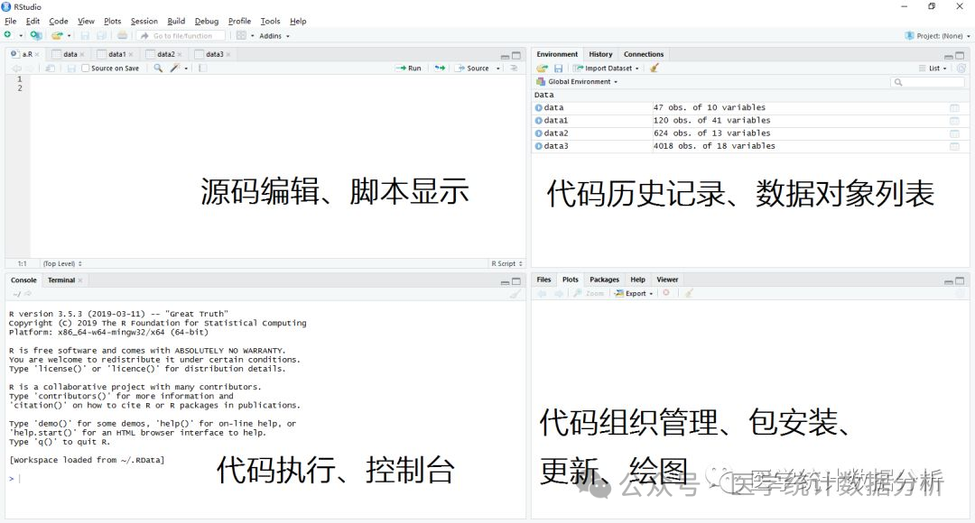 打开RStudio之后,会出现上图所示的窗口,其中有四个独立的面板。RStudio界面分为左上角的源码编辑、脚本显示,左下角的代码执行、控制台,右上角的代码历史记录、数据对象列表,右下角的代码组织管理、包安装、更新、绘图。