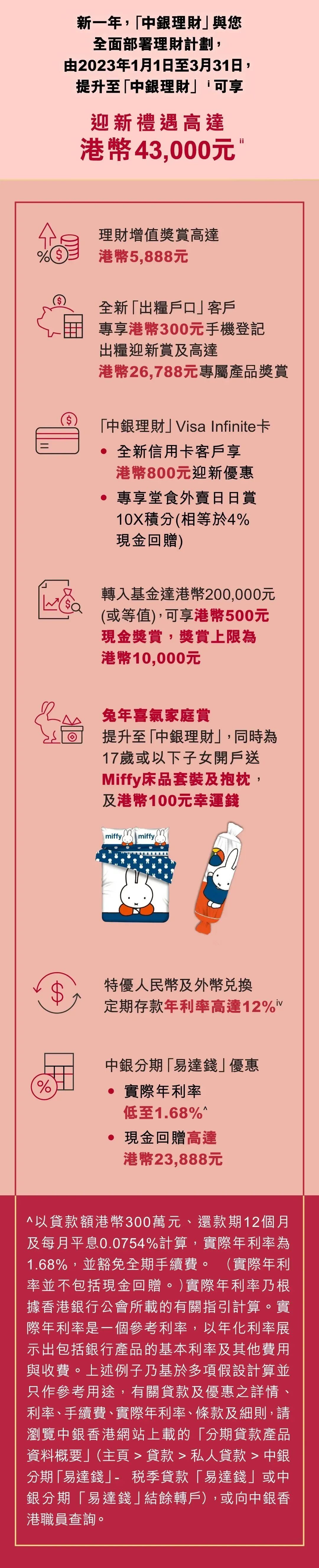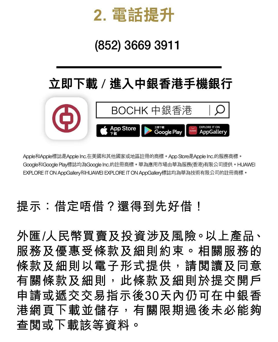 f. 上述產品、服務與優惠受有關條款約束,詳情請參閱相關宣傳品或向中銀香港分行職員查詢。