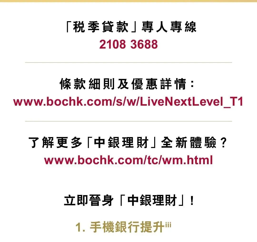 iii. 提升至「綜合理財服務」客戶須維持「綜合理財服務」達至指定金額以繼續享用相關「綜合理財服務」的專有服務、利益及優惠。詳情請瀏覽www.bochk.com/tc/wm/service.html查閱相關條款。