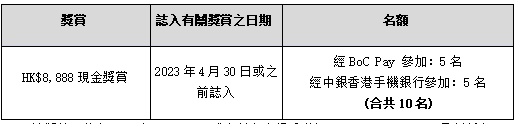 5. 抽獎結果將在2023年4月30日或之前在中銀香港網頁www.bochk.com、最新版本的BoC Pay及中銀香港手機銀行公佈,並按中銀香港紀錄的客戶電話號碼發送得獎通知短訊予獲獎客戶。