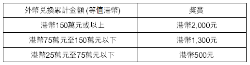 3. 合資格客戶須於外匯獎賞推廣期內以其持有的港元/外匯寶/人民幣賬戶經iGTB NET中銀企業網上銀行(「合資格交易渠道」)成功兌換外幣達以下指定累計金額,方可獲享獎賞(「外幣兌換獎賞」):