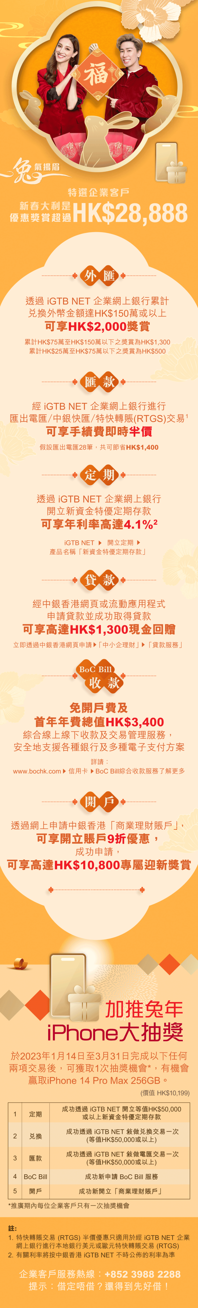 2. 只適用於2022年10月1日至2022年12月31日期間未曾於中銀香港iGTB NET企業網上銀行或iGTB MOBILE 移動銀行進行匯出交易的特選企業客戶。