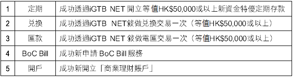 4. iGTB兌換外幣獎賞只適用於經中銀香港 iGTB NET 辦理(a)以港元兌換為外幣的交易、 (b)以外幣兌換為港元的交易 及(c) 交叉盤兌換交易(「合資格兌換交易」)。