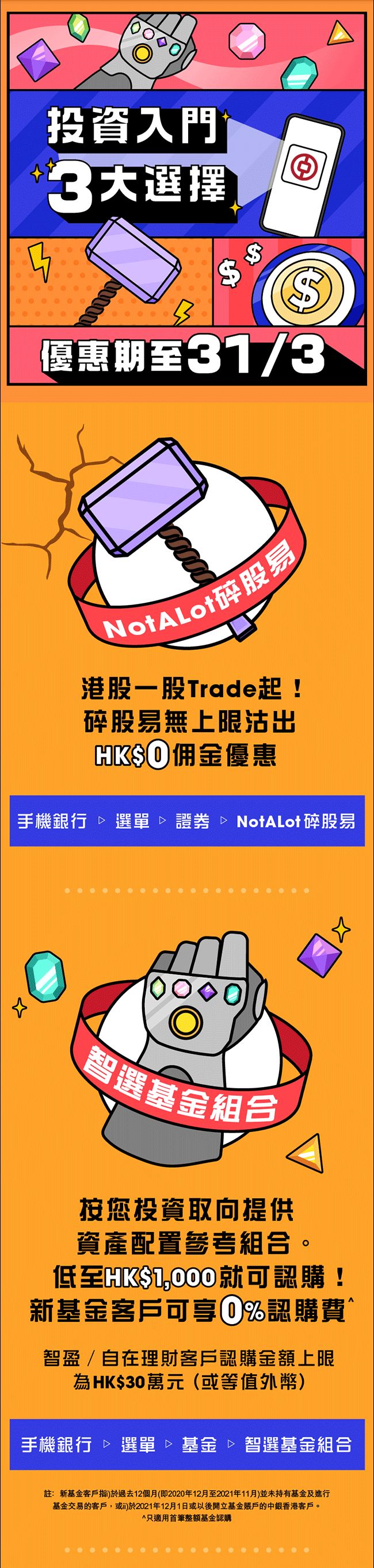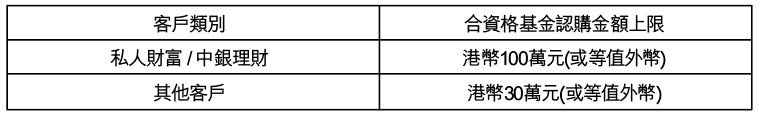 c. 於推廣期內,合資格客戶透過電子渠道(即手機銀行、「智選基金組合」或網上銀行)或分行 (包括電話委辦指示服務)進行首筆整額基金認購(「合資格認購」),可享0%認購費(「認購費減免」)。合資格基金認購金額上限如下︰