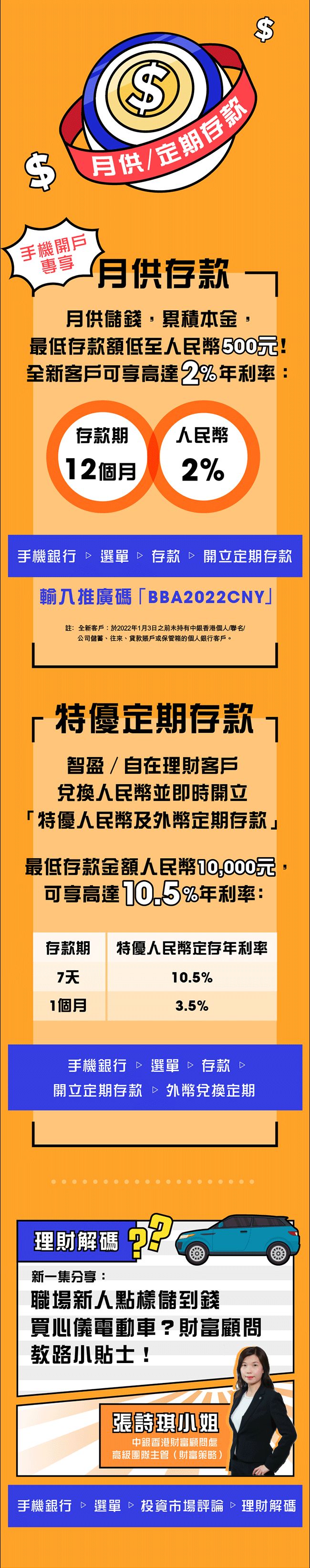 c. 合資格客戶於推廣期內成功透過中銀香港手機銀行輸入指定推廣碼,開立全新「月供存款(手機開戶)」,方可獲享此優惠。以上月供存款年利率是根據中銀香港2022年1月3日公佈的月供存款年利率為示例,僅供參考,實際年利率將根據中銀香港不時公佈的為準。
