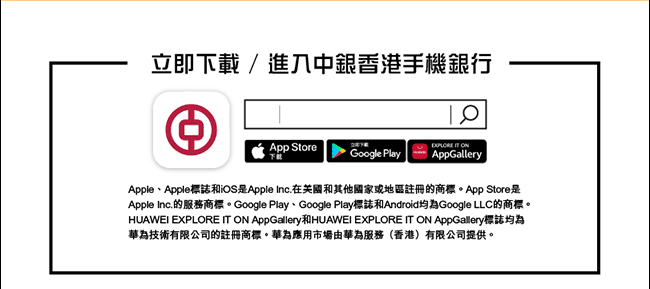 ・ 請透過官方軟件應用商店或中銀香港網頁下載中銀香港流動應用程式,並注意搜尋的識別字樣。
