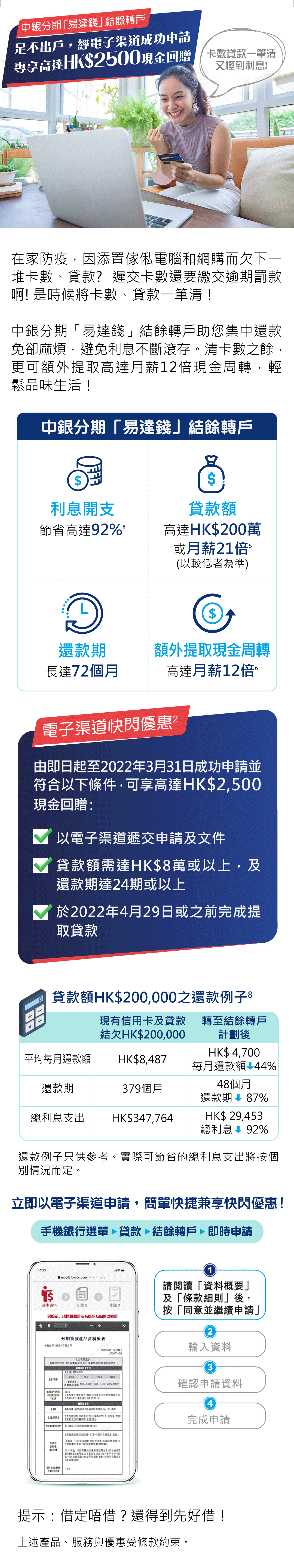 • 於推廣期內申請中銀分期「易達錢」結餘轉戶,而成功貸款額達港幣8萬或以上及還款期達24期或以上; 及