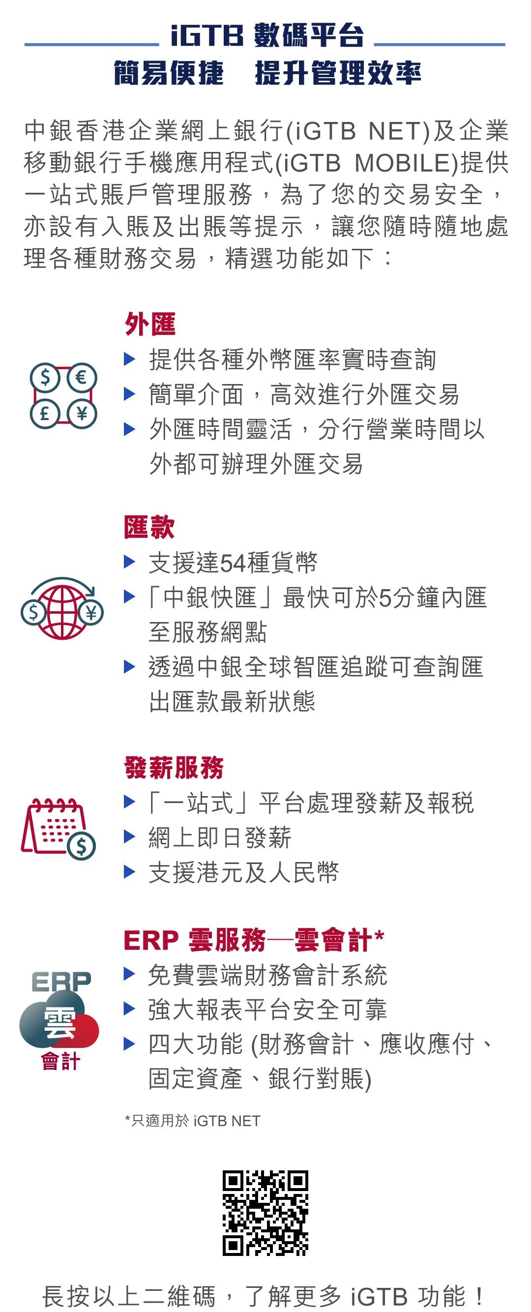 • 瀏覽人士使用中銀香港企業網上銀行及/或中銀香港企業流動應用程式即表示同意中銀香港於企業網上銀行及企業流動應用程式不時所載之免責聲明及政策。