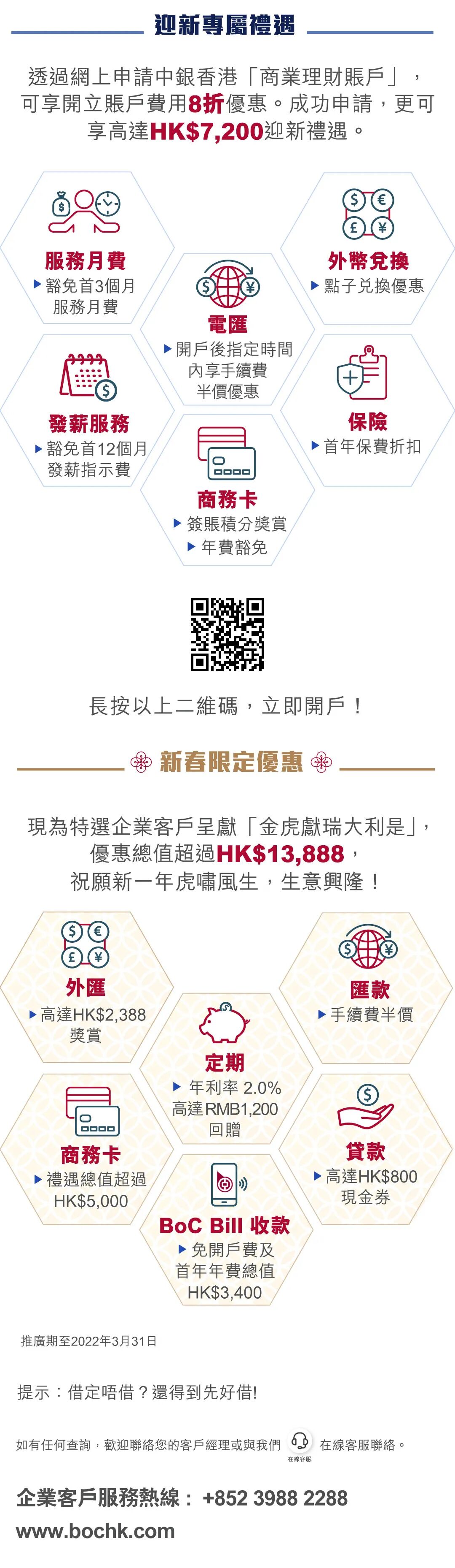 1. 除特別註明之外,以下優惠之推廣期為2022年1月17日至2022年3月31日,包括首尾兩天(「推廣期」),並只適用於已選用「商業理財賬戶」並收到此推廣電郵的中國銀行(香港)有限公司(「中銀香港」)企業客戶(「特選企業客戶」) 。