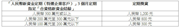 2. 特選企業客戶須於定期推廣期內透過iGTB NET以開立3個月「人民幣新資金定期(特選企業客戶)」達指定「合資格新資金結餘」要求,方可享特優人民幣年利率2%及高達人民幣1,200元定期獎賞(「定期合資格客戶」),詳情如下: