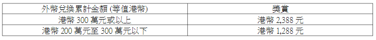 3. 合資格客戶須於外匯獎賞推廣期內以其持有的港元/外匯寶/人民幣賬戶經中銀香港分行、專人接聽電話銀行、中銀企業網上銀行或iGTB NET(「合資格交易渠道」) 成功兌換外幣達以下指定累計金額,方可獲享獎賞(「外幣兌換獎賞」):