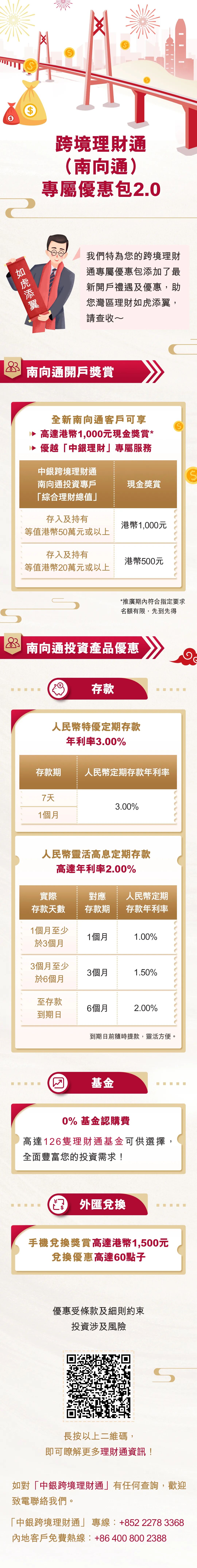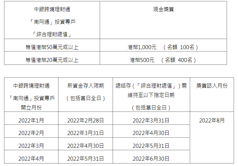 客戶須於誌入現金獎賞金額時仍持有效中銀跨境理財通「南向通」投資專戶,否則相關現金獎賞將被取消。