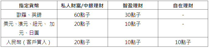 b. 受本條款及細則所限,此優惠只適用於「綜合理財服務」客戶於外幣兌換點子優惠推廣期內透過中銀香港分行、網上銀行、手機銀行及專人接聽電話銀行服務以電匯價以港元兌換指定貨幣或以指定貨幣兌換港元,方可享以下外幣兌換點子優惠。